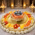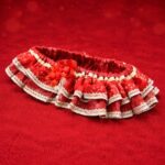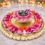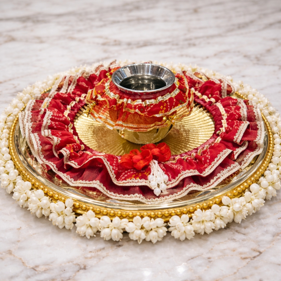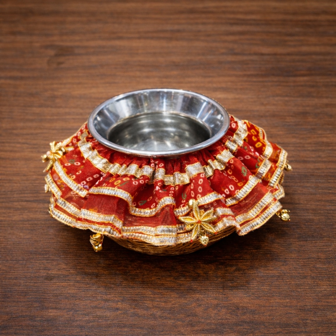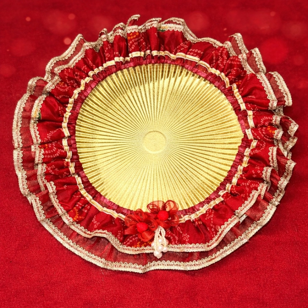 A festive detachable frill designed to dress up any thali and lota effortlessly. Crafted in rich bandhej fabric with layered frills, gold lace detailing, and delicate pearl and floral accents, it instantly adds a celebratory touch to pooja setups and wedding rituals. Versatile and elegant, these frill transforms everyday metal ware into a beautiful­­­ly adorned festive essential.