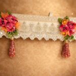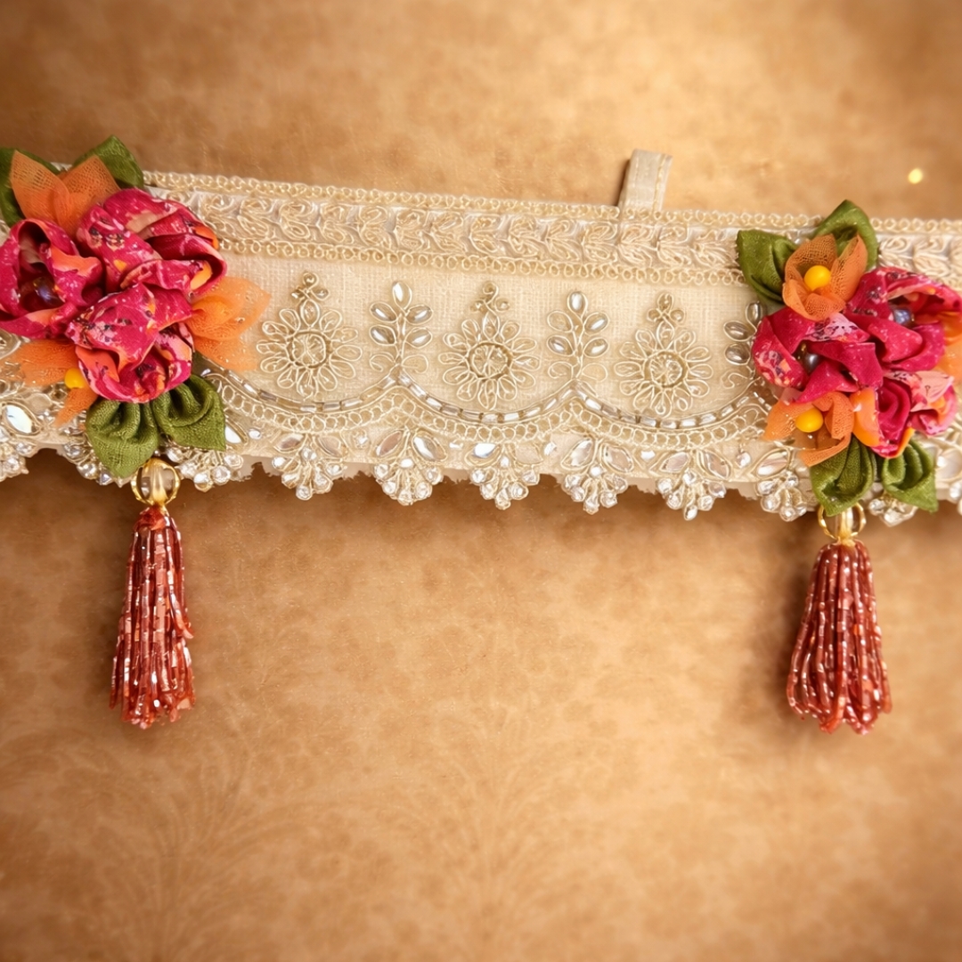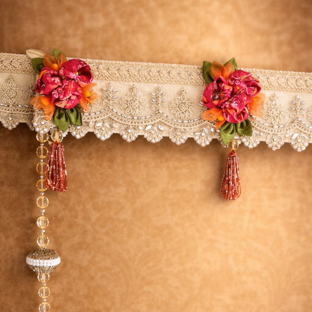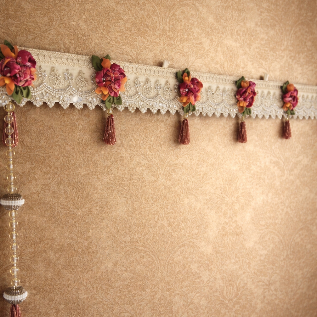 A contemporary blend of embroidered lace, handcrafted floral accents, and subtle mirror work. Finished with minimal cut dana tassels and soft festive shimmer, this toran adds refined elegance to doors, mandirsand modern celebration places.