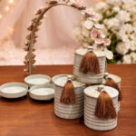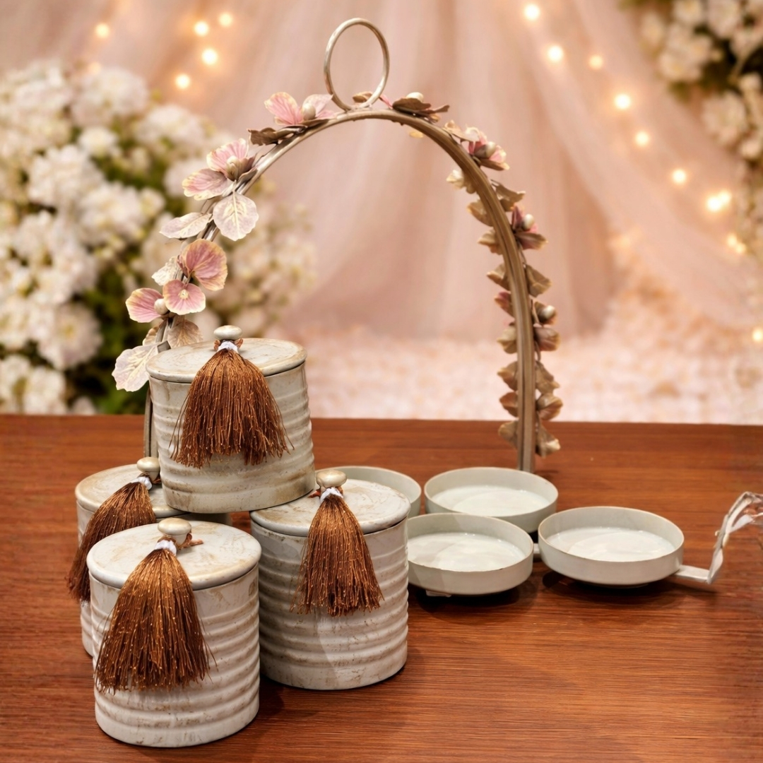 A refined set of airtight metal jars with soft powder-coated, rust-resistant finish, each designed ro hold 200-250gms of contents. Paired with beautifully crafted metal stand featuring delicate floral detailing, this set blends functionality with elegance. Ideal for storing dry fruits, sweets or premium gifting, the floral stands adds graceful, decorative touch to any setting.