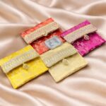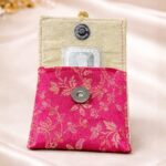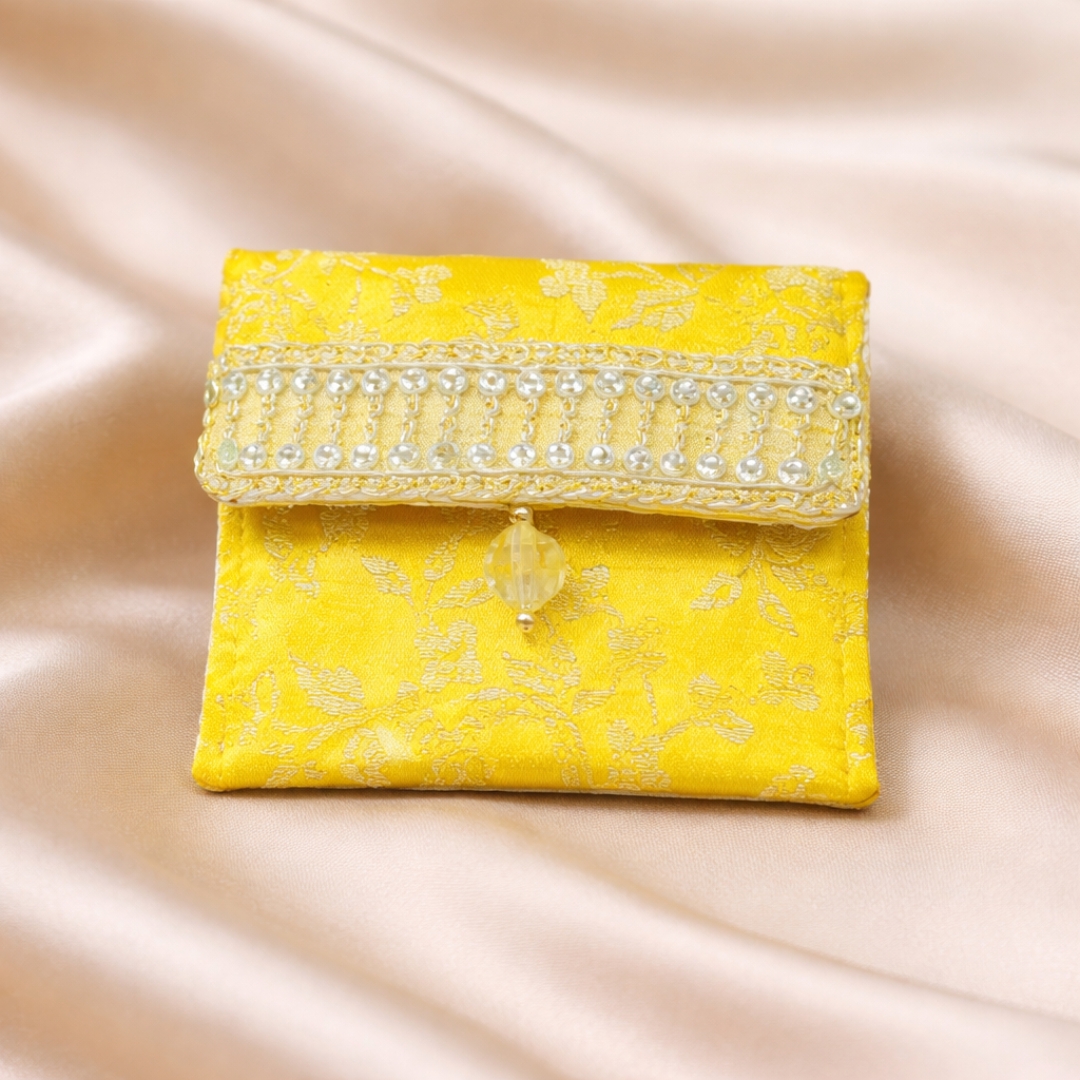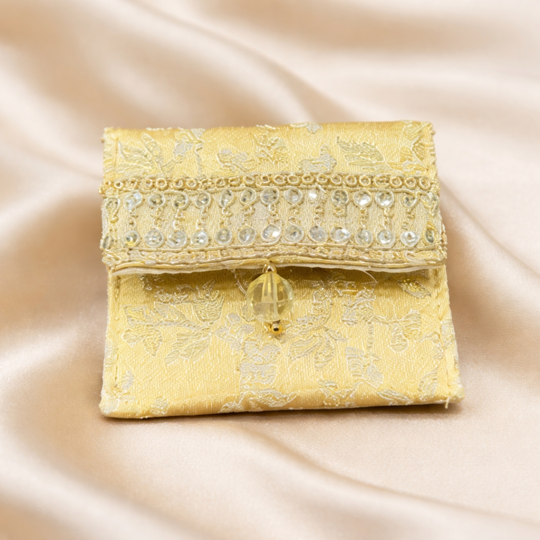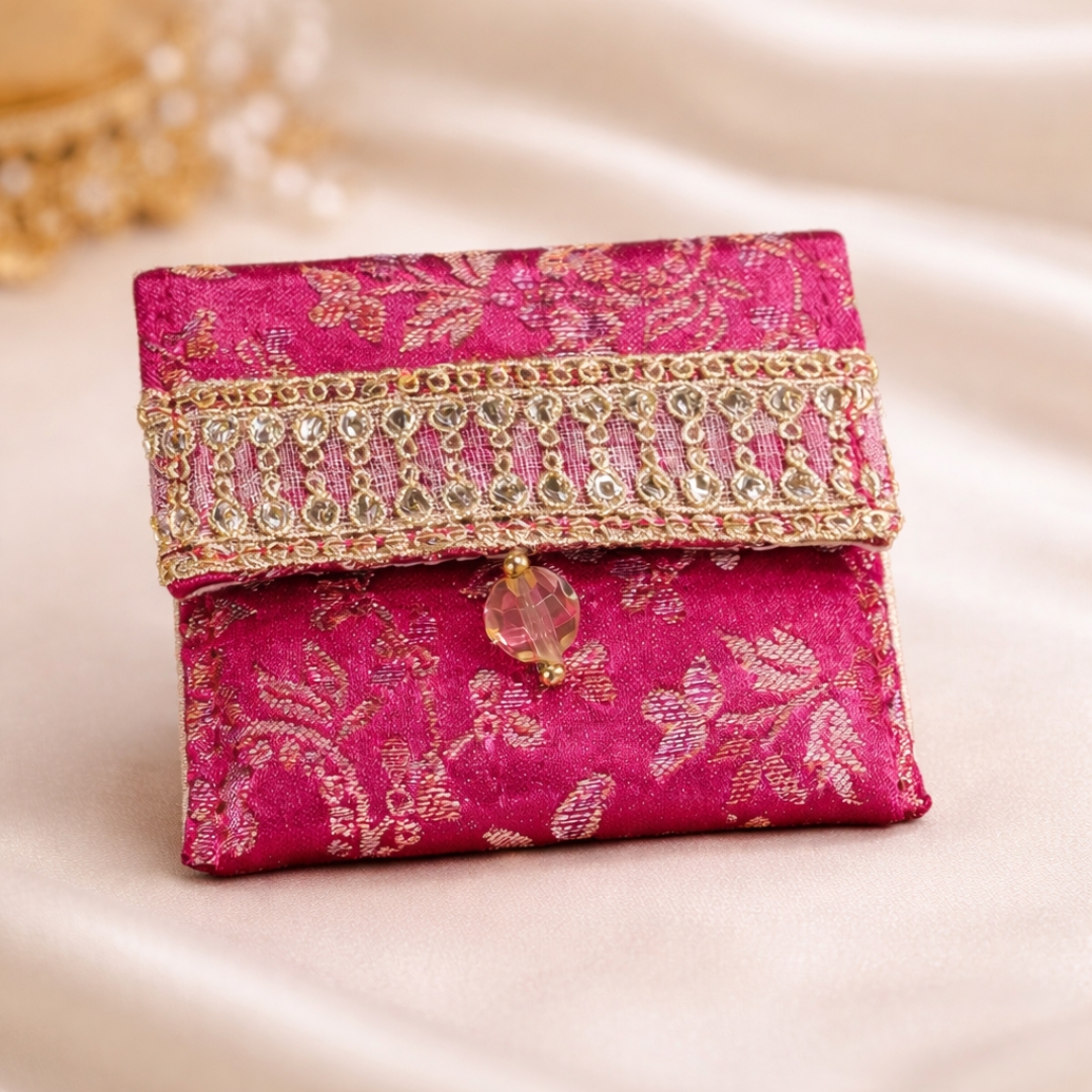 These elegant coin pouches are crafted from rich brocade fabric and finished with intricate lace detailing and secure flap closure. Designed in festive hues, they are perfect for presenting coins or small shagun during wedding, puja and special occasions.