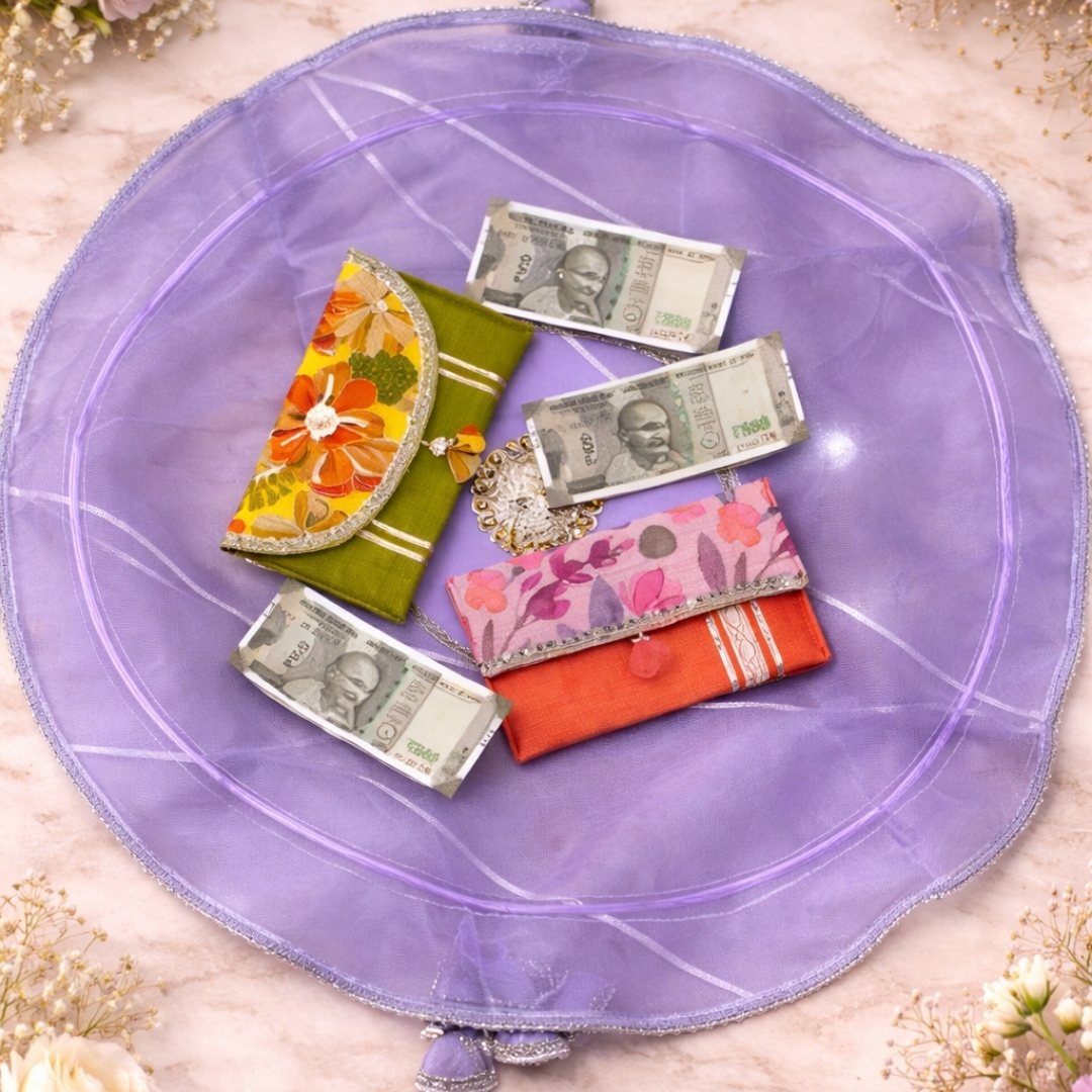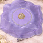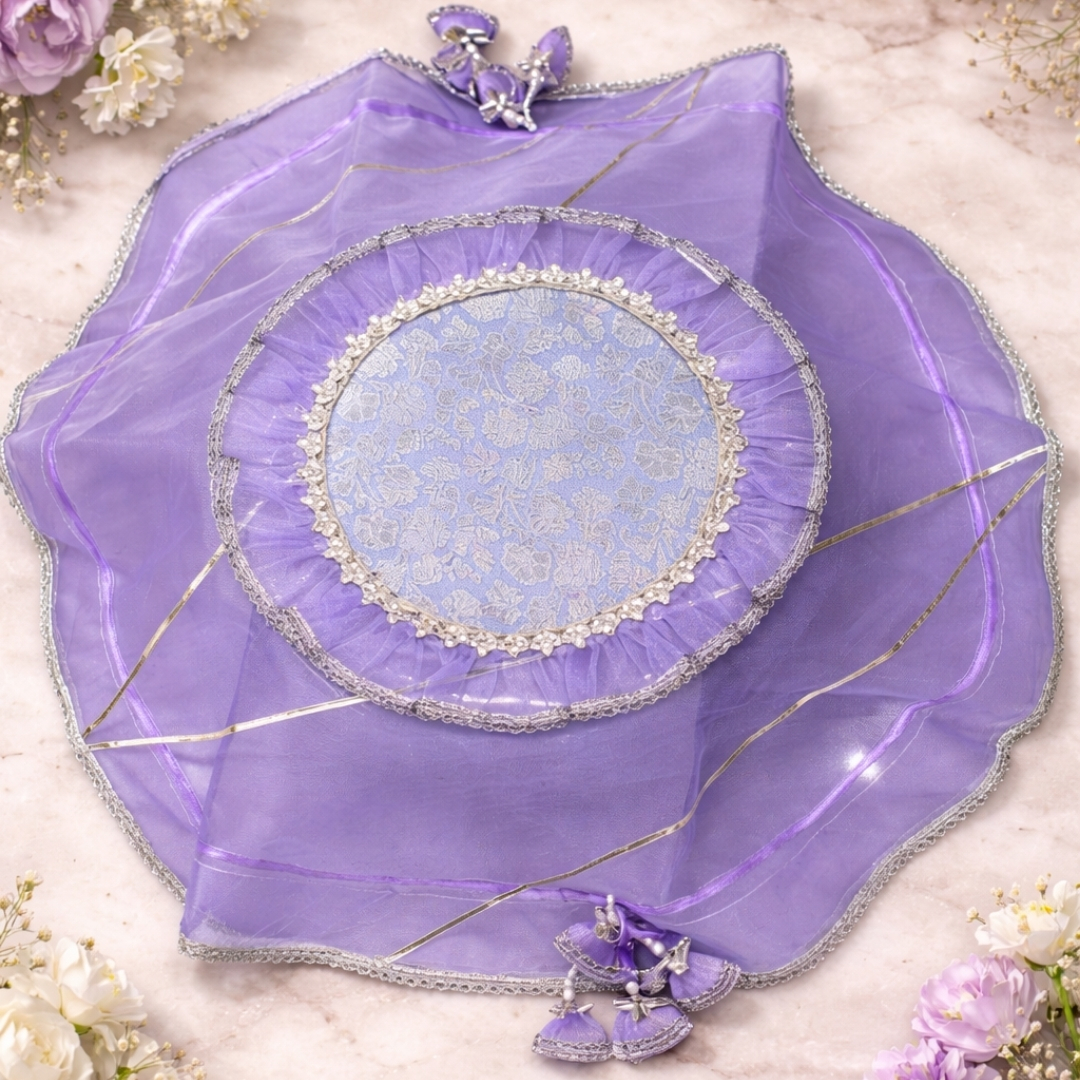 An elegant handcrafted lap cover designed in soft pastels hues, featuring sheer layered fabric with delicate silver lace edging. The centre showcases a subtle brocade weave, beautifully framed by ruffled detailing that adds volume and grace. This lap cover is perfect for pooja rituals, wedding ceremonies or traditional setups- adding a touch of sophistication and charm to every occasion.