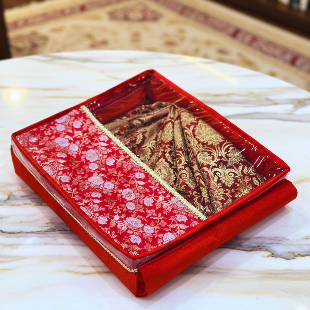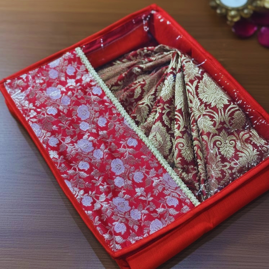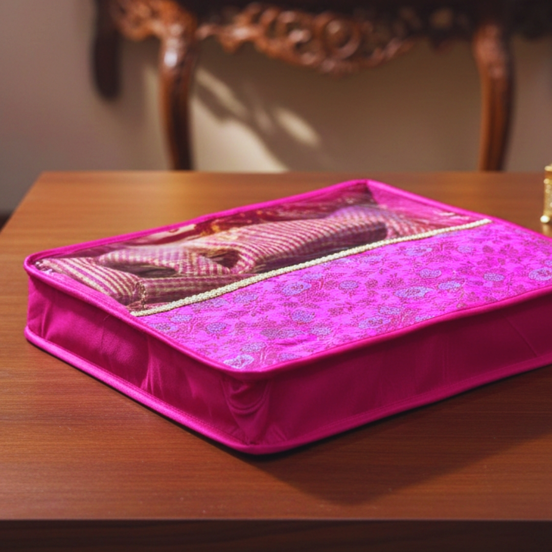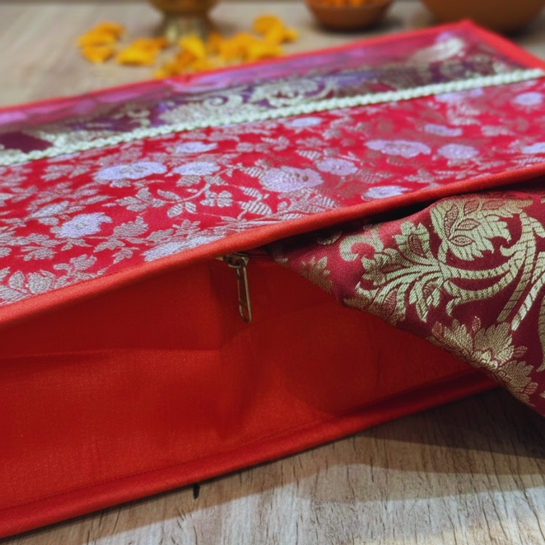 Luxurious brocade saree cover crafted in a thick sturdy fabric with elegant detailing. Designed to comfortably store upto two sarees. It offers enhanced protection while adding a rich, festive touch- ideal for bridal trousseau, wardrobe storage, and gifting.