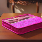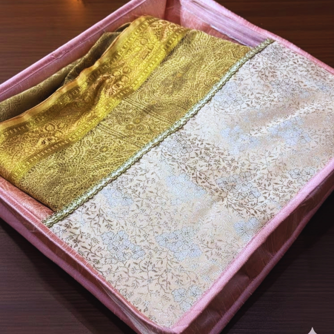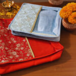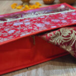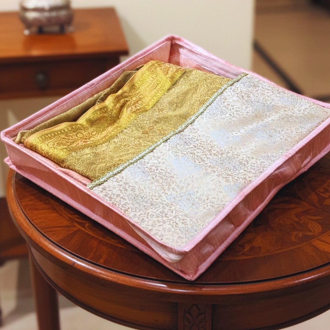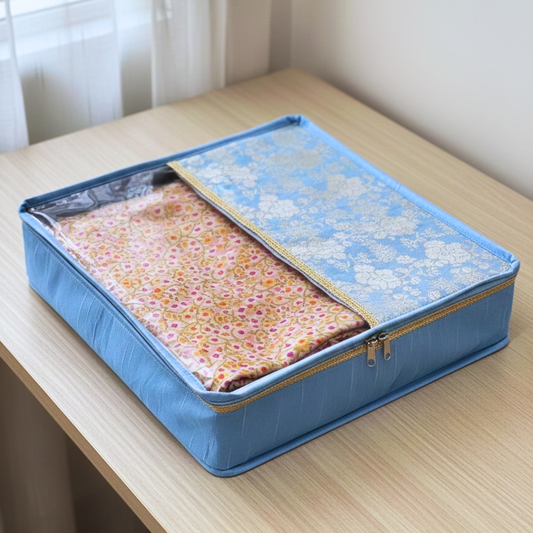 Luxurious brocade saree cover crafted in a thick sturdy fabric with elegant detailing. Designed to comfortably store upto two sarees. It offers enhanced protection while adding a rich, festive touch- ideal for bridal trousseau, wardrobe storage, and gifting.