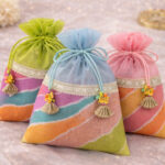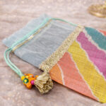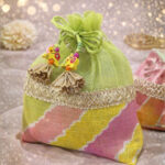 These elegant potlis  are handcrafted using premium fabric and adorned with delicate traditional embellishments. Designed to hold dry fruits and other gifting items securely, they add a festive and luxurious touch to weddings, puja and special occasions.