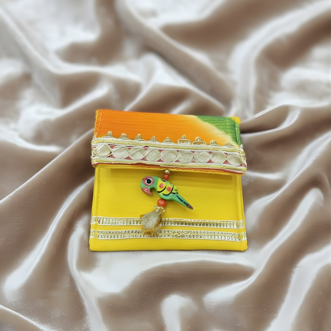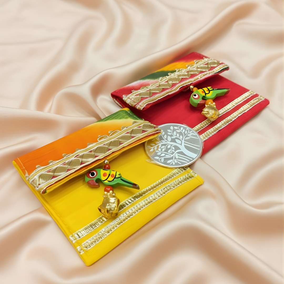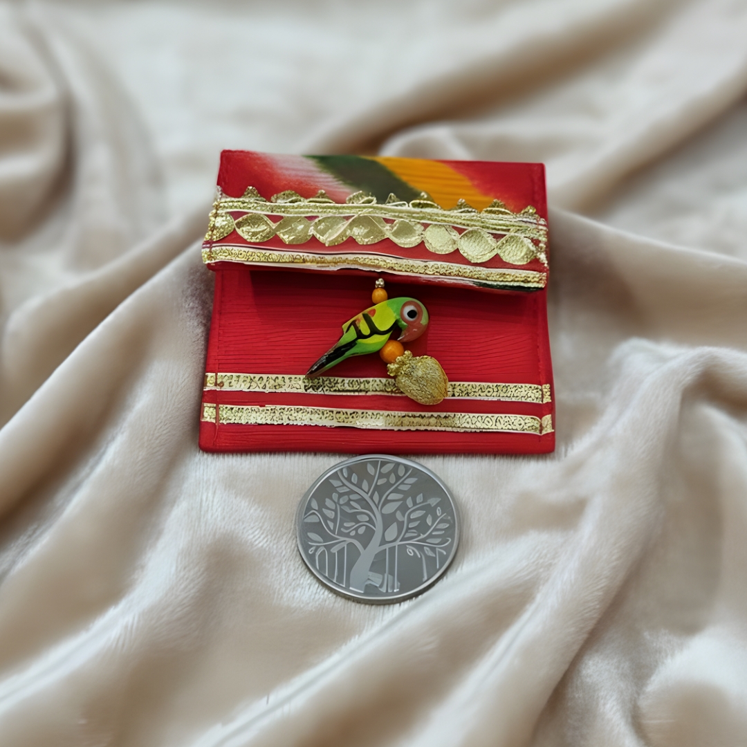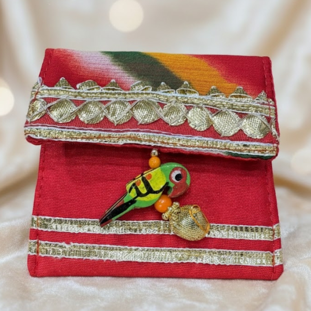 These charming coin pouches are handcrafted in bright festive fabrics, accented with elegant lace borders and playful handcrafted parrot embellishments for traditional touch. Designed in festive hues, they are perfect for presenting coins or small shagun during wedding, puja and special occasions.