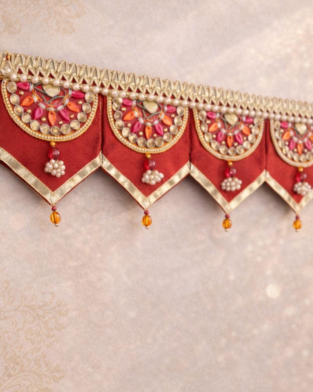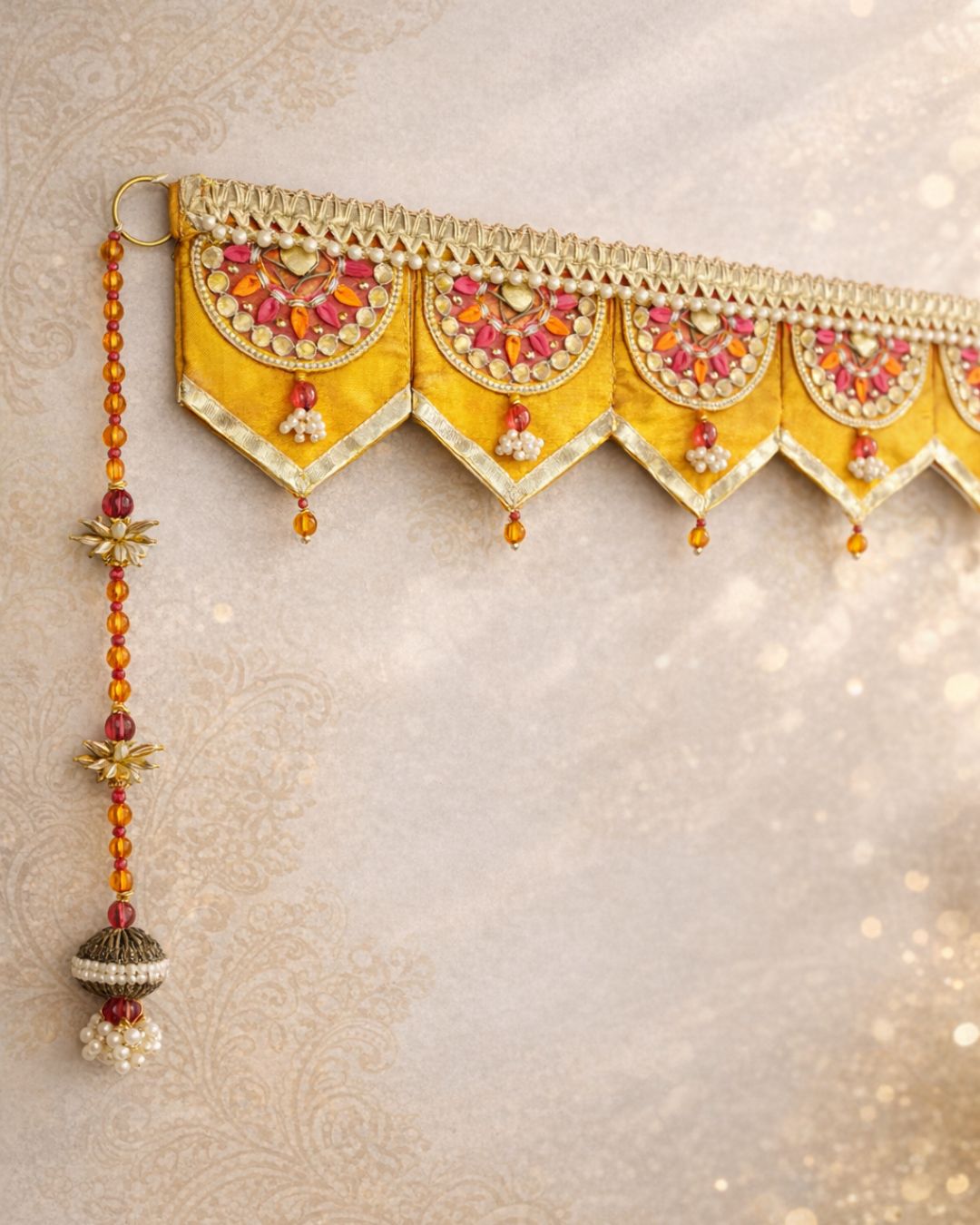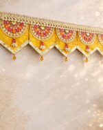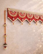 A contemporary take on traditional décor, featuring structured pentagon panels accented with intricate handwork, lace details and bead hangings giving it a structured yet traditional look. Designed to bring festive touch to any entrance.