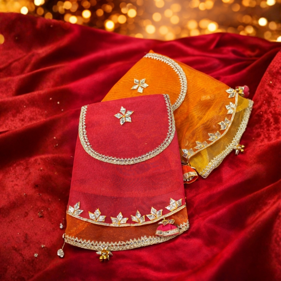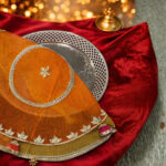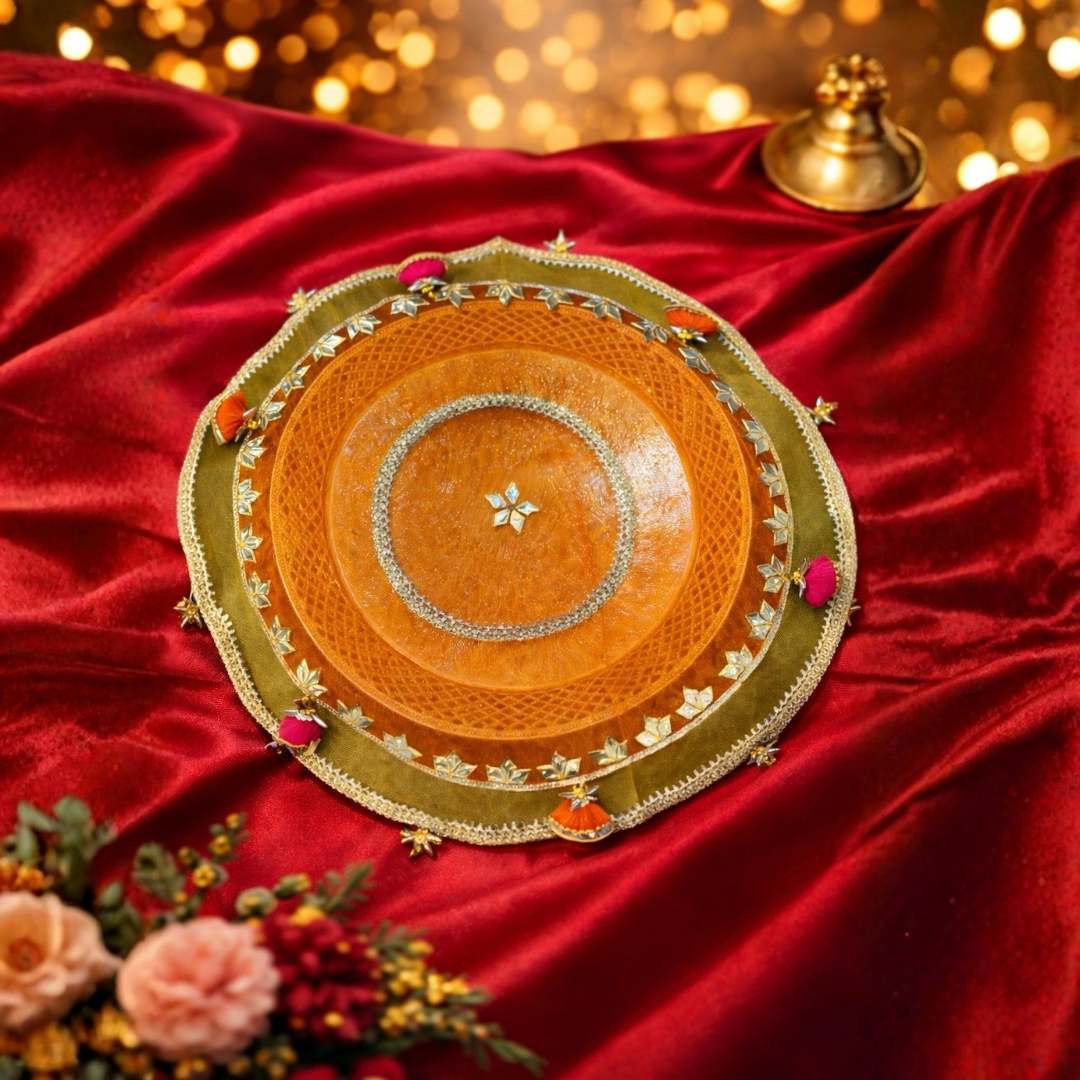 Elegant round thal cover crafted in organza with gota patti detailing, silver lace borders, and festive latkans-perfect for weddings and pooja rituals.