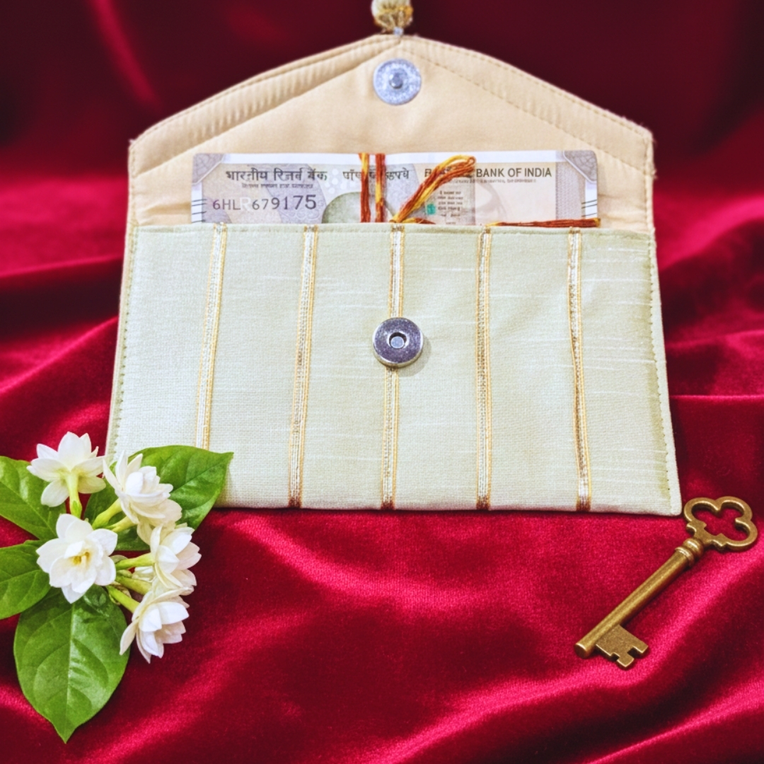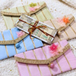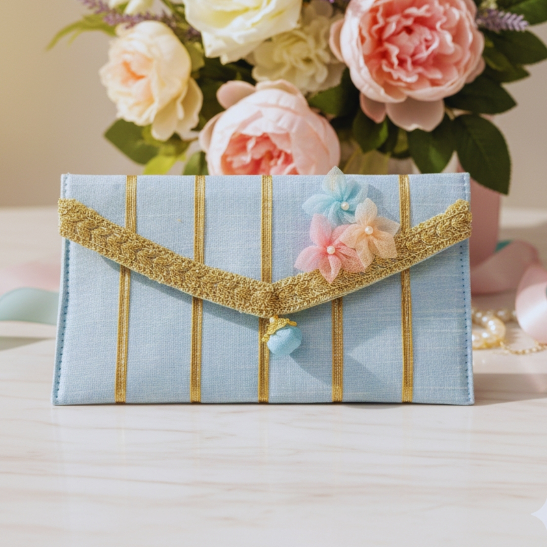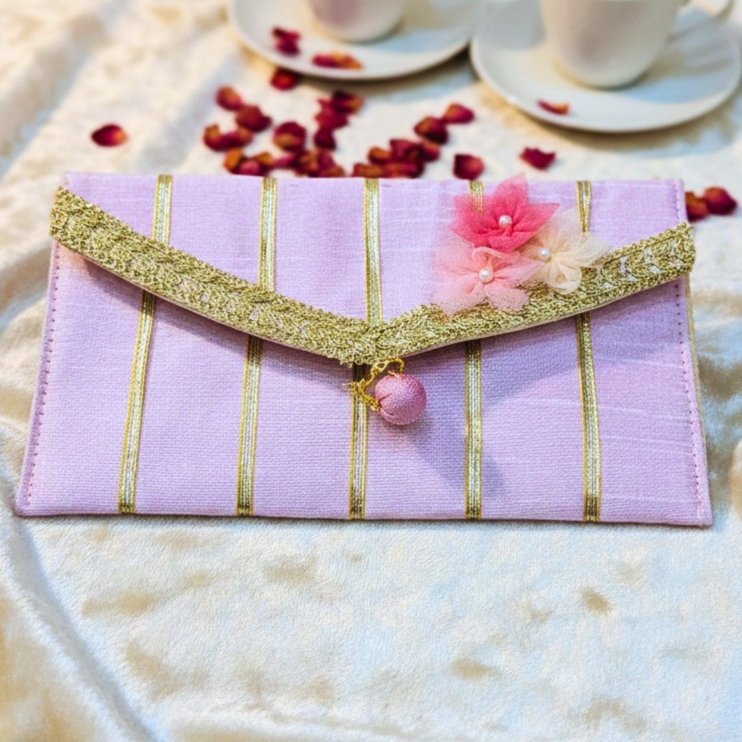 Soft pastel envelopes crafted with subtle gold stripes, delicate lace edging and handmade floral accents. Elegant, festive and graceful- perfect for shagun, weddings and refined celebrations.