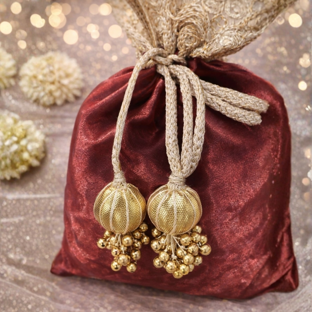These elegant potlis  are handcrafted using premium fabric and adorned with delicate traditional embellishments. Designed to hold dry fruits and other gifting items securely, they add a festive and luxurious touch to weddings, puja and special occasions.