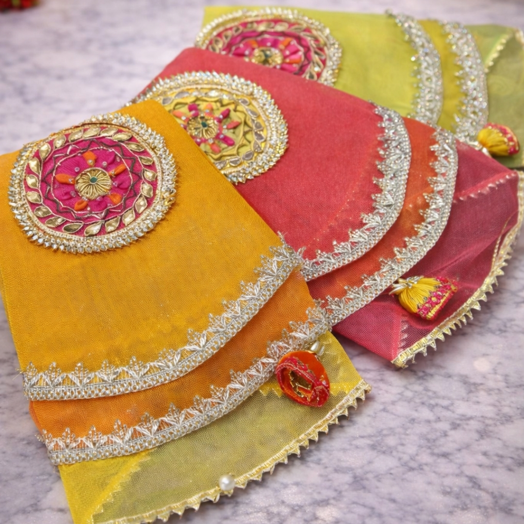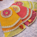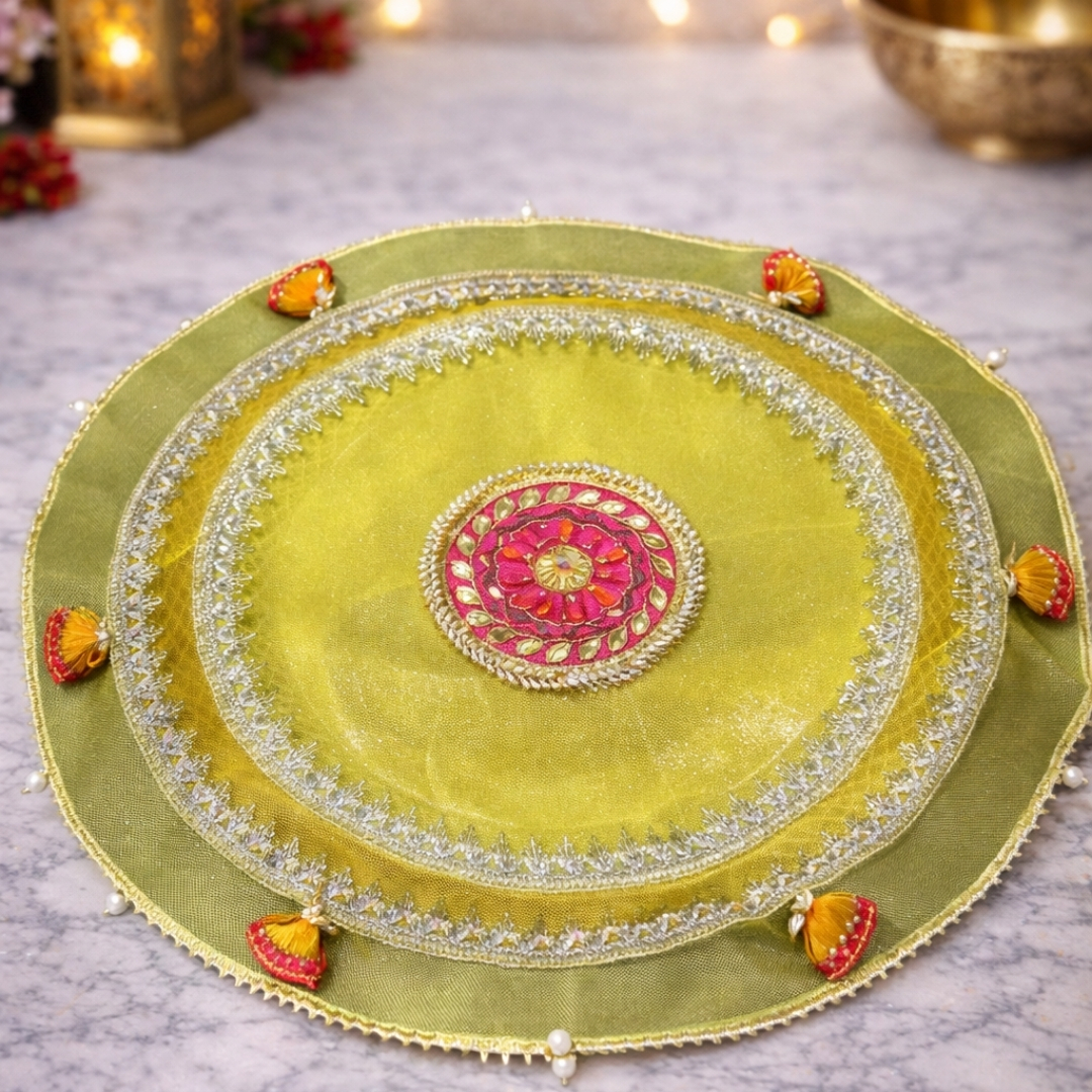 This elegant thal cover is crafted in sheer organza, highlighted with fine gold zari lines radiating from a beautifully embroidered central motif. Finished with a subtle golden border and delicate latkans along with edges. And the layered fabric gives it a soft sheen while keeping the look traditional and refined. Perfect for weddings and pooja rituals.